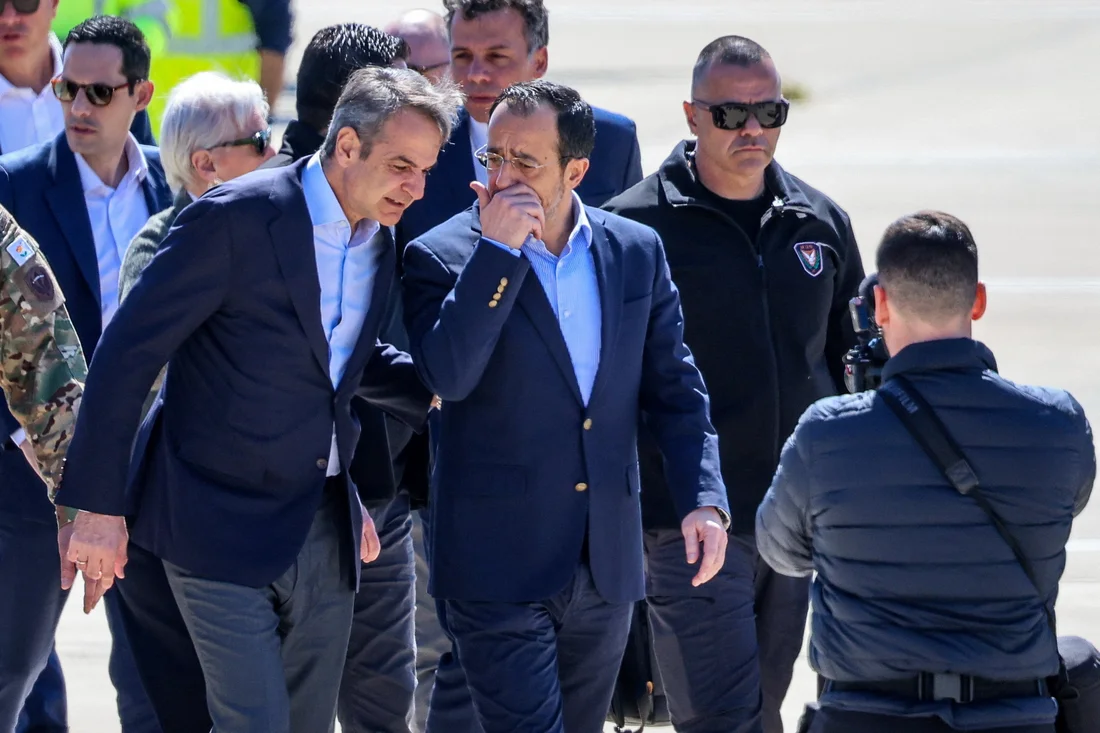 MACRON, MITSOTAKIS ARRIVE IN SOUTH CYPRUS