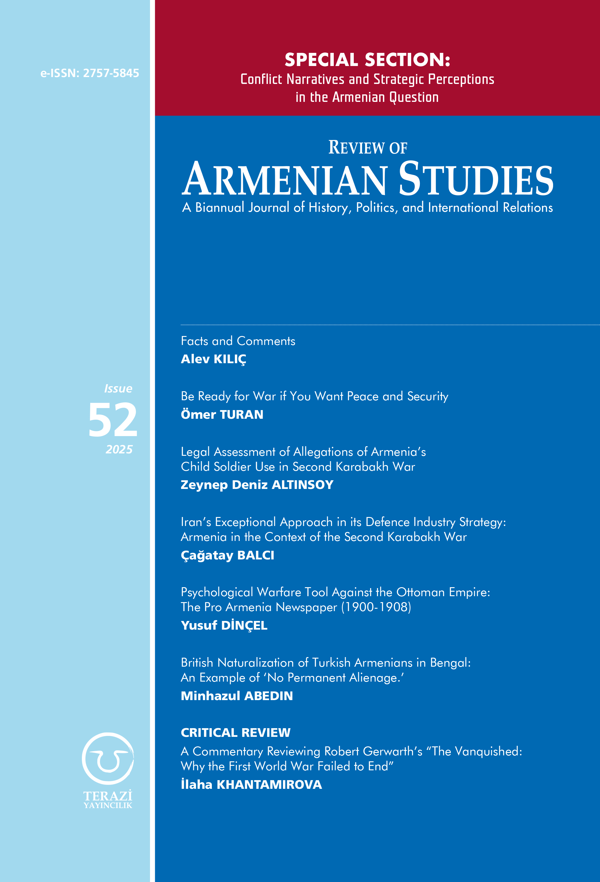 Review of Armenian Studies’nin (RAS) 52. sayısının yayımlandığını duyurmaktan büyük mutluluk duyuyoruz. Bu sayı, Ermeni meselesi ve Güney Kafkasya’nın tarihsel ve güncel dinamikleri üzerine kanıta dayalı akademik çalışmalar sunma konusundaki kararlılığımızı sürdürmektedir.