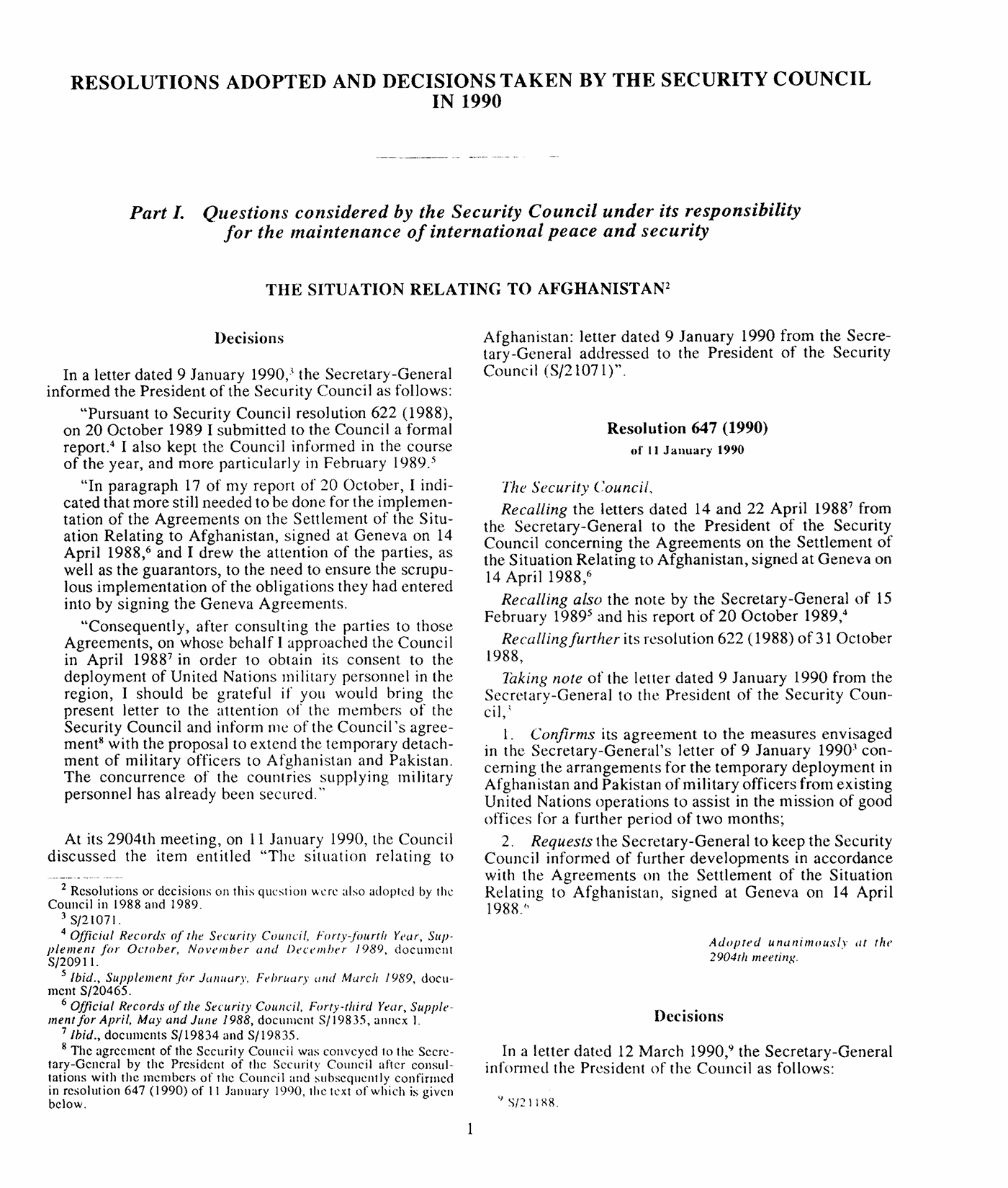Birleşmiş Milletler Güvenlik Konseyi’nin 647 (1990) sayılı kararı, Afganistan’daki durum ve 14 Nisan 1988 tarihli Cenevre Anlaşmalarının uygulanması bağlamında BM Genel Sekreteri’nin iyi niyet misyonuna kurumsal destek sağlamaktadır. Konsey, Genel Sekreter’in 9 Ocak 1990 tarihli mektubunda önerilen düzenlemeleri onaylayarak Afganistan ve Pakistan’da mevcut BM operasyonlarından geçici olarak görevlendirilecek askerî subayların iki ay süreyle konuşlandırılmasına izin vermekte ve sürecin gelişmeleri hakkında bilgilendirilmeye devam edilmesini talep etmektedir