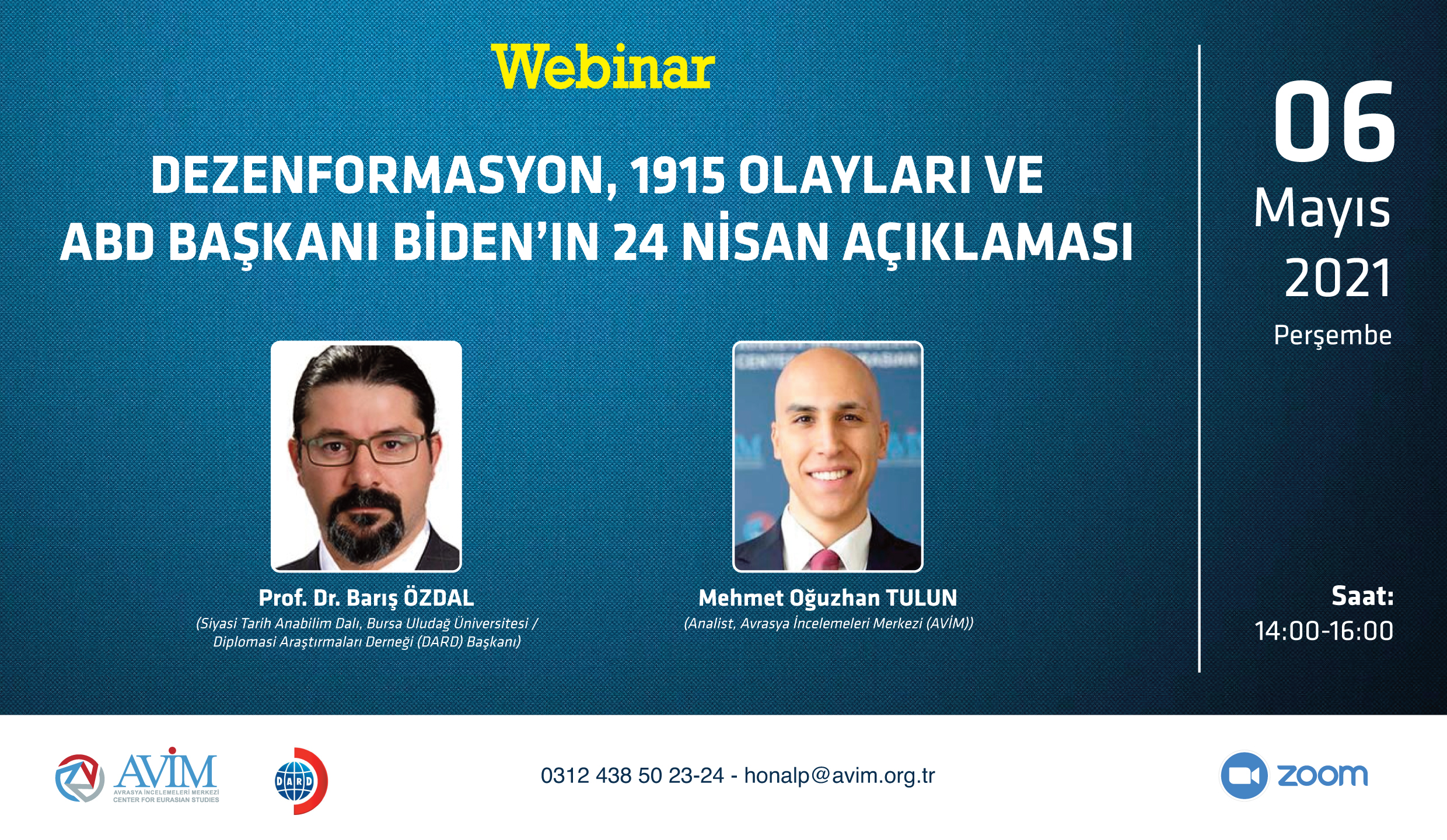 6 Mayıs 2021 Perşembe günü, Avrasya İncelemeleri Merkezi (AVİM) ve Diplomasi Araştırmaları Derneği (DARD) iş birliğiyle “Dezenformasyon, 1915 Olayları Ve ABD Başkanı Biden’ın 24 Nisan Açıklaması” başlıklı bir webinar düzenlenecektir.