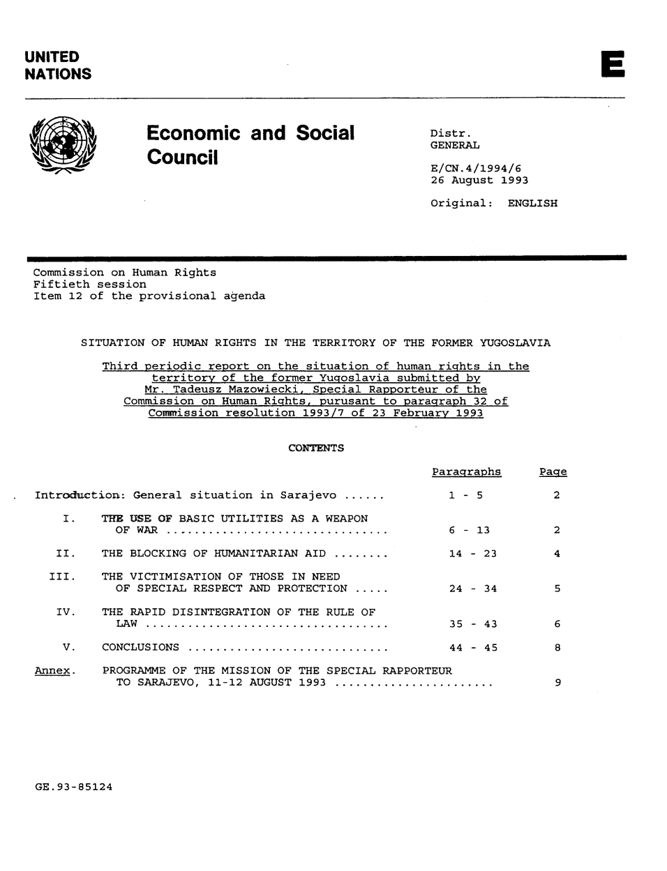 Situation of human rights in the territory of the former Yugoslavia : 3rd periodic report on the situation of human rights in the territory of the former Yugoslavia / submitted by Tadeusz Mazowiecki, Special Rapporteur of the Commission on Human Rights, p